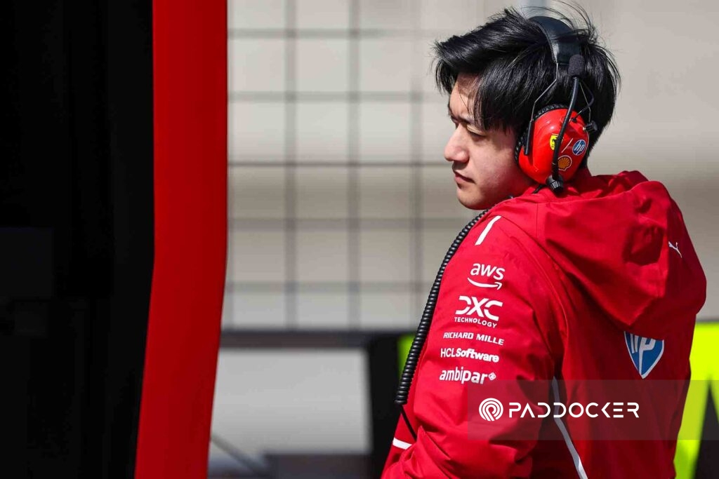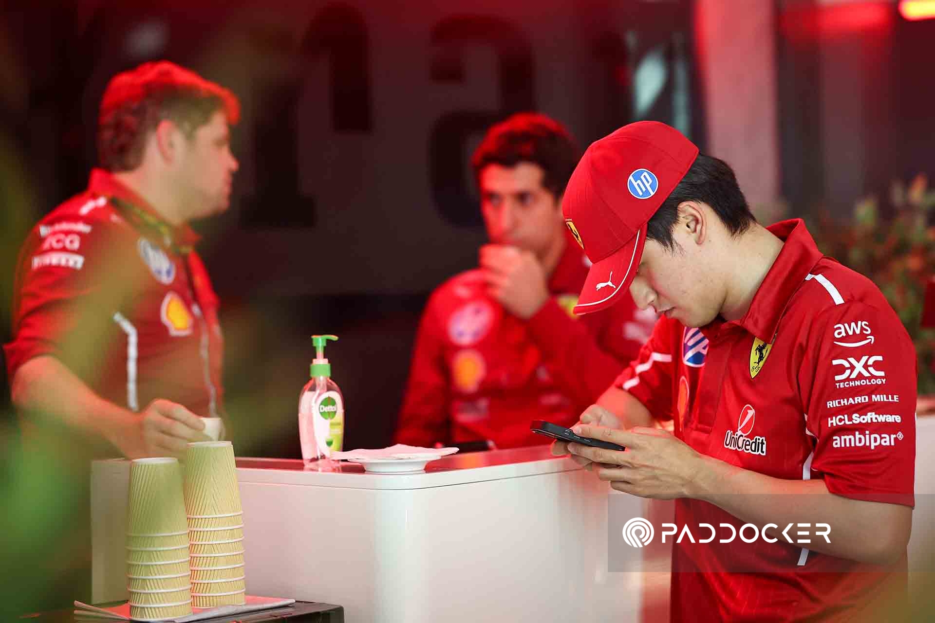 JEDDAH, SAUDI ARABIA - APRIL 17: Zhou Guanyu of China and Scuderia Ferrari HP plays his phone in the paddock during previews ahead of the F1 Grand Prix of Saudi Arabia at Jeddah Corniche Circuit on April 17, 2025 in Jeddah, Saudi Arabia.(Photo by Qian Jun/Paddocker)